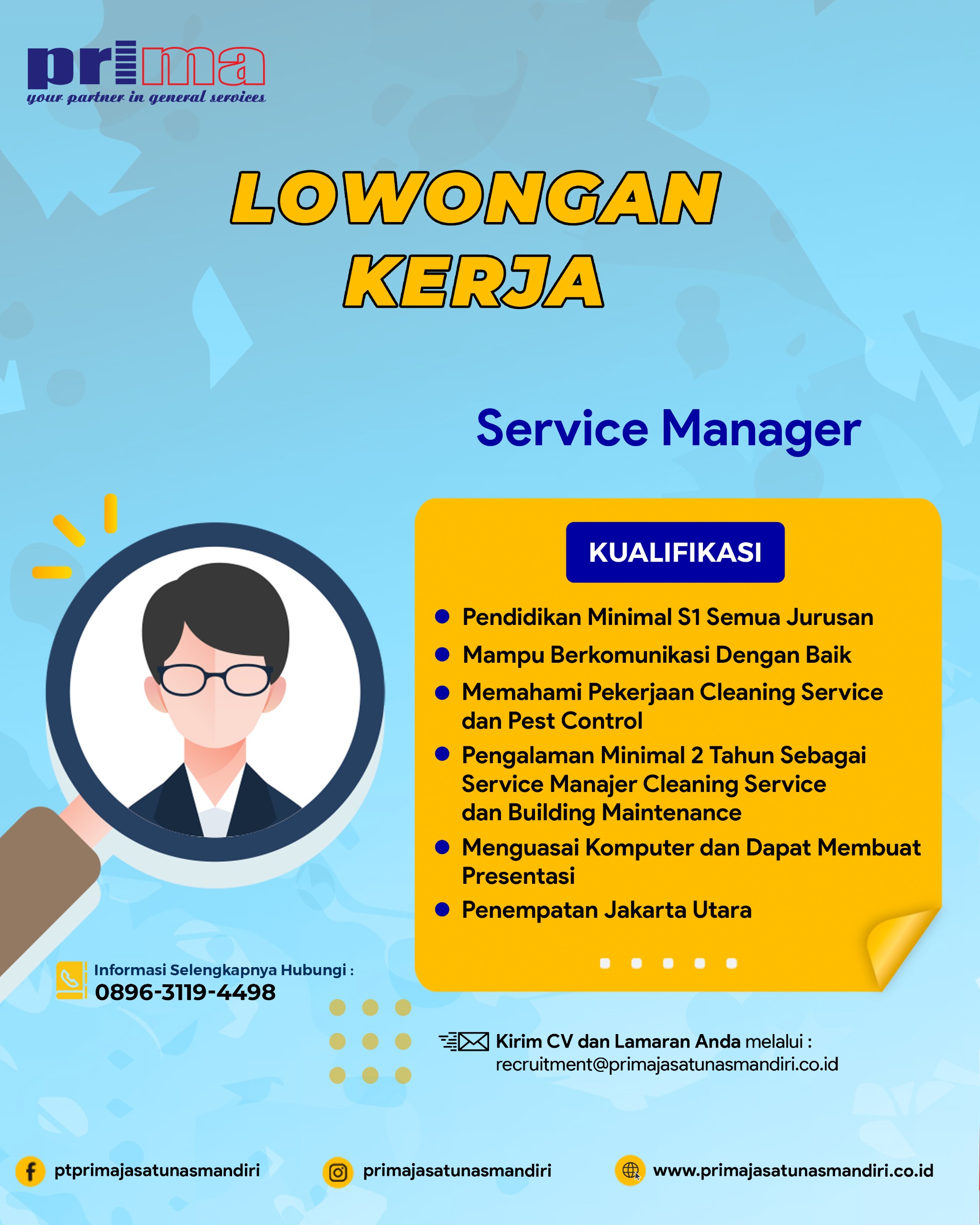 PT Prima Jasa Tunas Mandiri membuka kesempatan bagi profesional berpengalaman untuk bergabung sebagai Service Manager. Posisi ini bertanggung jawab dalam pengelolaan operasional layanan Cleaning Service, Pest Control, dan Building Maintenance serta memastikan kualitas layanan berjalan optimal.